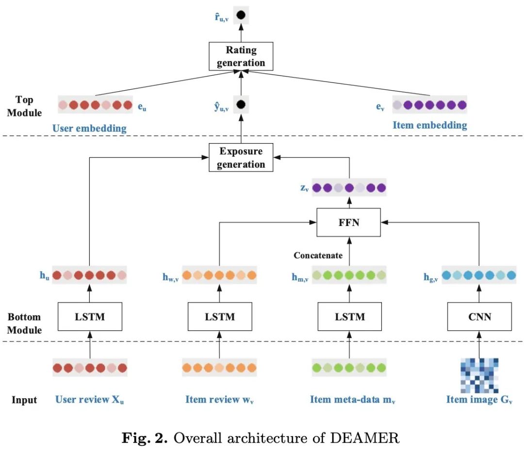 在之前的工作中,基于内容的推荐系统往往会受到数据稀疏的影响,导致模型会对已交互的物品表示过度特定化,而未知的物品表示则几乎不可区分。为了缓解这一问题,该工作提出了 DEAMER (Deep Exposure-Aware Multimodal contEnt-based Recommender) 模型。