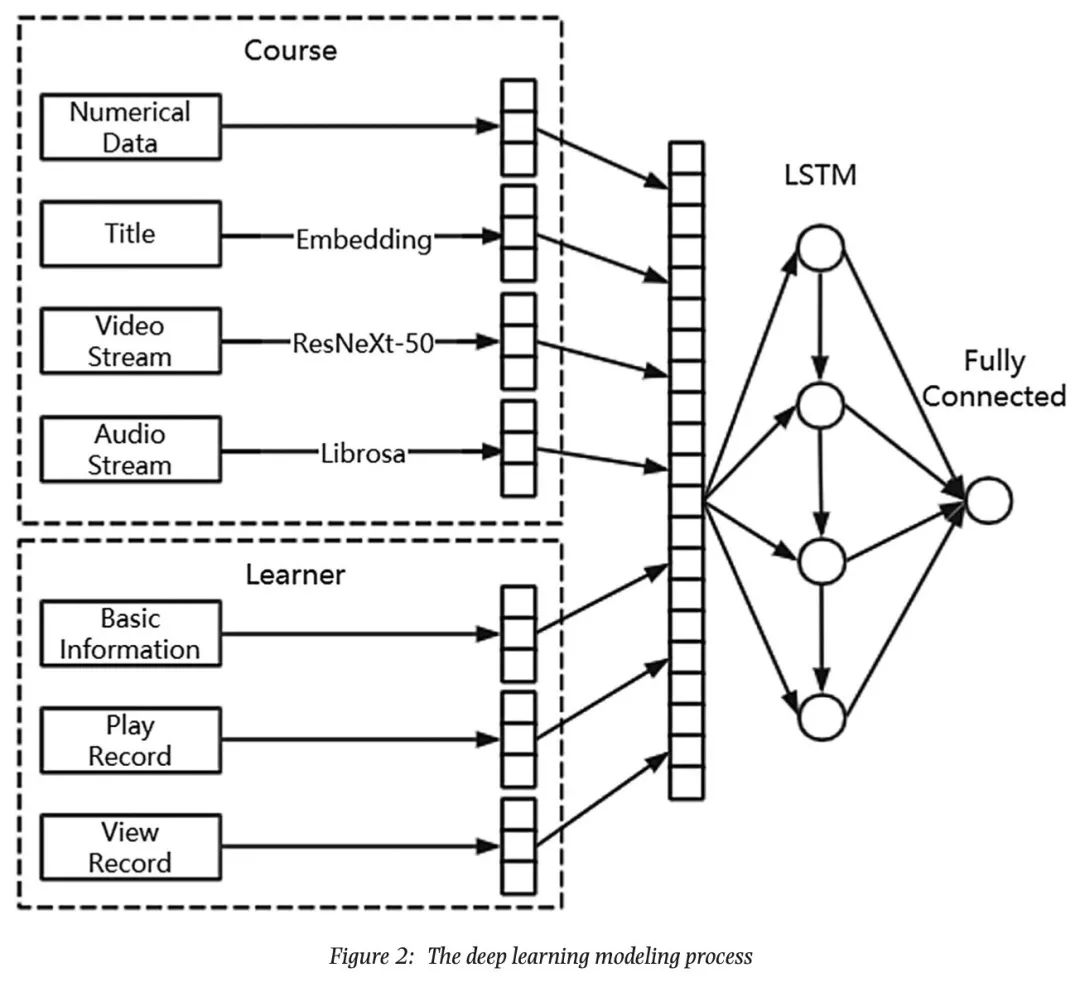 该工作中使用了不同种类、不同模态的数据,如课程标题、课程视频以及课程的其他数值特征。对与课程的标题,该工作在去除了停用词之后,使用预训练好的词表示,再使用这些词表示的平均值作为标题的表示。