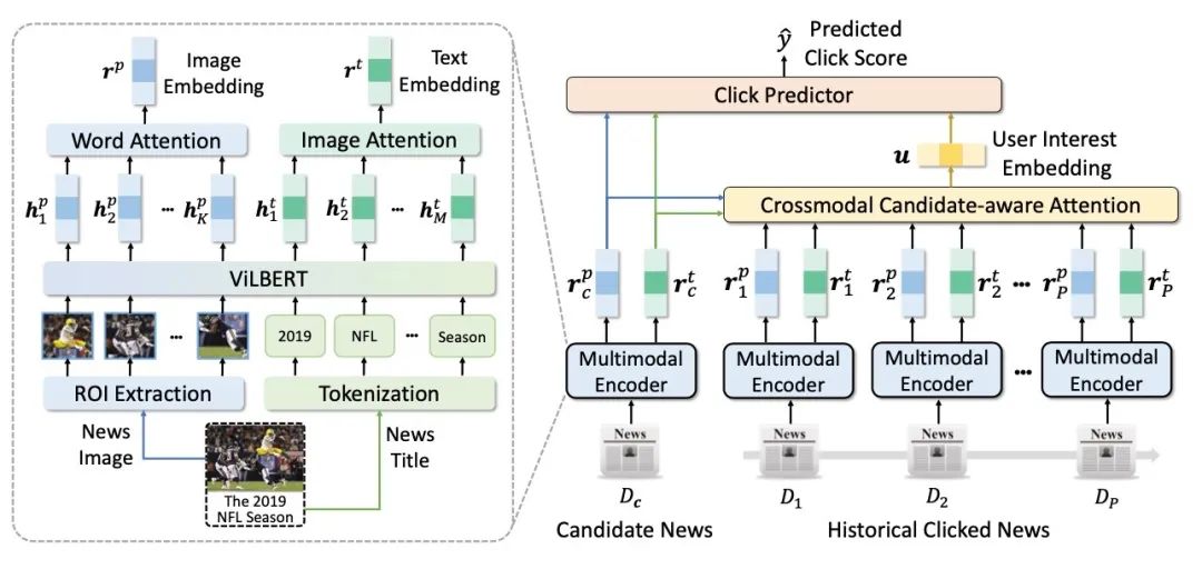 最后,为了得到更加准确的用户建模,该工作还提出了一个跨模态候选注意网络,计算了候选新闻与历史新闻之间的跨模态关联度,通过融合这些多模态信息来得到更好的用户建模。