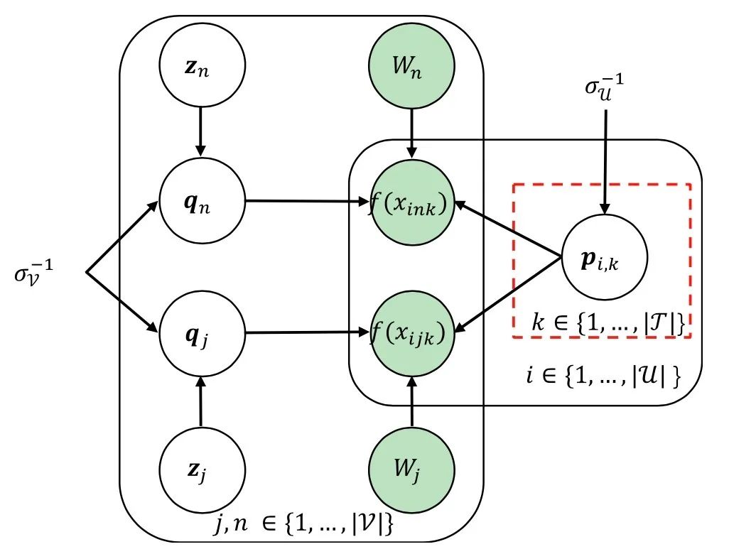 这个模型针对用户行为的时空特点,建立了一个与时间相关的一个用户偏好模型,能够更好的捕捉用户行为。并且为了缓解数据稀疏问题,该模型引入了 POI 的语义信息,并使用 BPR 框架来学习隐式交互,模型结构如下图所示: