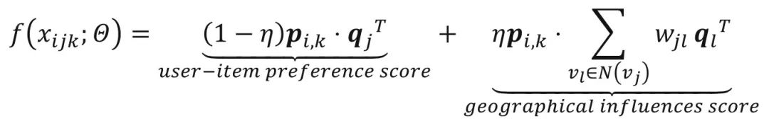 其中 为地点 和地点 间的距离关联度,计算方法为 , 为 之间的距离。从这个打分函数可以看出,该工作在传统的矩阵分解方法的基础上增加了临近地点对目标地点表示的影响。