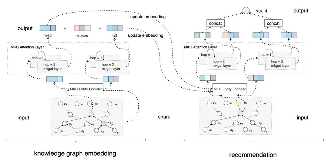 该工作的主要贡献是提出了多模态知识图谱自注意力网络 MKGAT (Multi-modal Knowledge Graph Attention Network)。这个模型相比于传统的知识图谱推荐,他能够利用多模态的信息来增强推荐效果。该模型的模型图如下所示,主要由两个模块组成:多模态知识图谱嵌入模块和推荐模块。