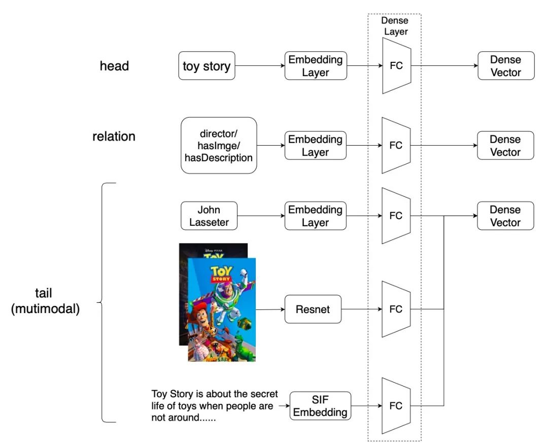 为了将多模态实体合并到模型中,多模态知识图谱嵌入模块也会学习不同模态数据的表示。简单的说,就是该模块首先会为尾实体不同的模态使用不同的编码器,随后再统一到和头实体同样的维度上。如下图所示: