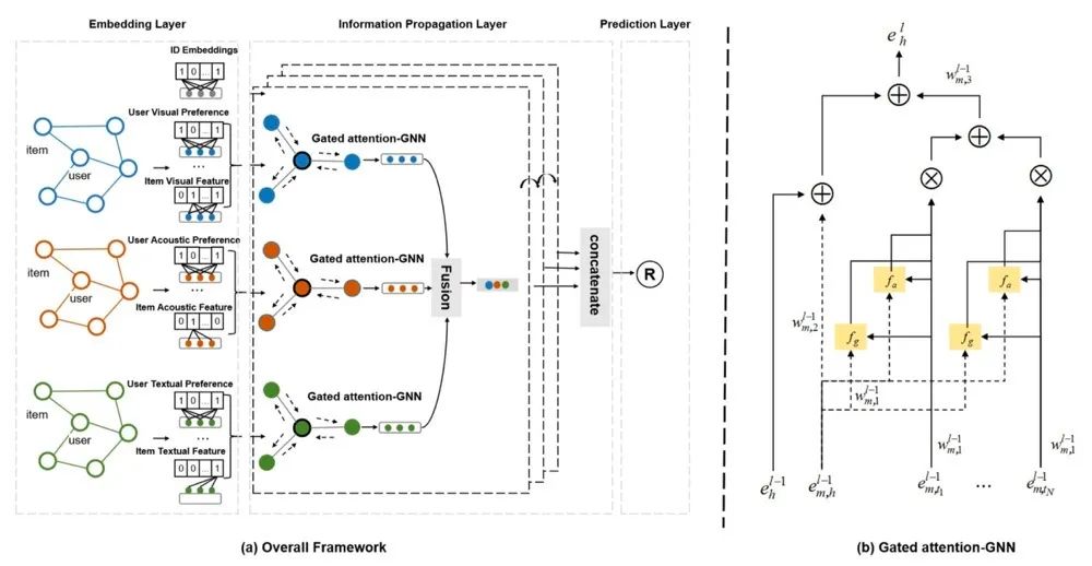 MGAT 能在不同模态的交互图上进行信息传播,同时利用门控注意机制识别不同模式对用户偏好的不同重要性分数。因此,它能够捕获隐藏在用户行为中的更复杂的交互模式,并提供更准确的建议。