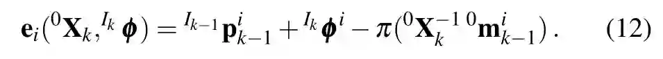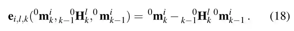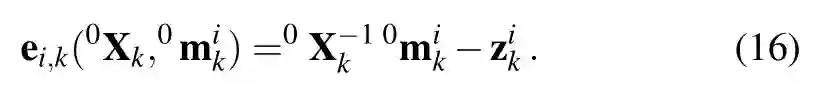 四种测量/观测被整合到一个联合优化问题中:三维点测量,视觉里程计测量,动态目标上点的运动的观测和目标平滑运动的观测。定义三维点的测量模型误差为: