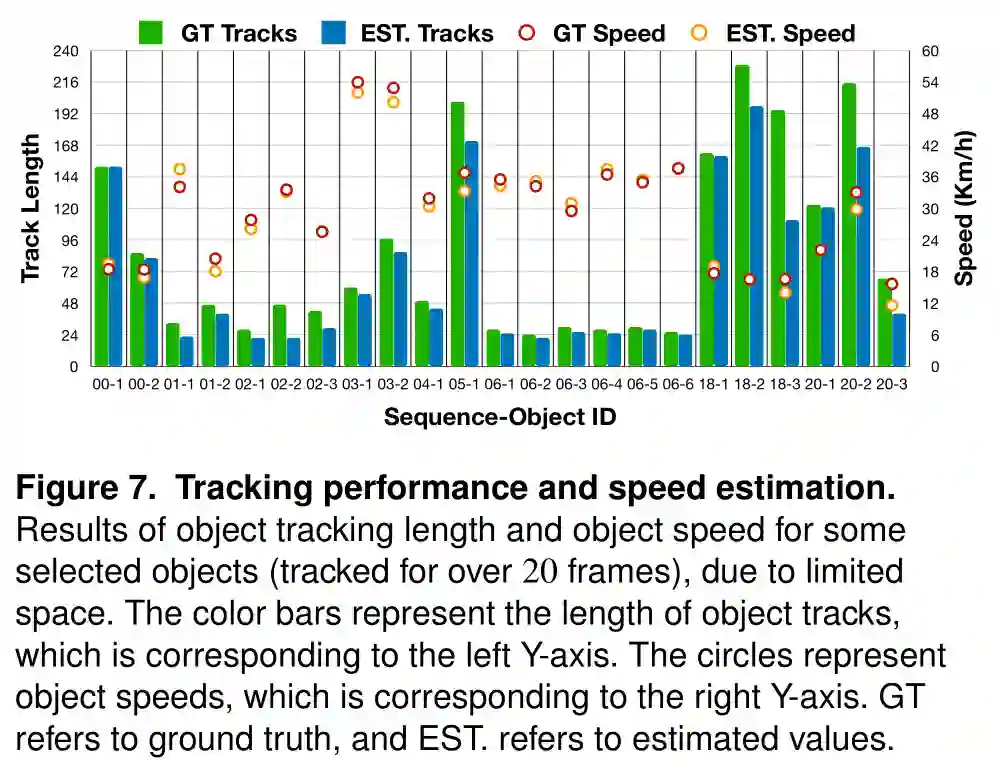 我们还演示了系统对于动态目标跟踪的性能,并展示了对于目标速度估计的结果,这是自主驾驶应用的重要信息。图7给出了在所有测试序列中,一些选中目标(跟踪超过20帧)的跟踪长度和速度(估计)的结果。我们的系统能够跟踪大多数目标在其出现的序列中超过80%的比例。此外,我们估计的目标速度始终与其真实速度接近。