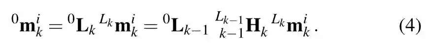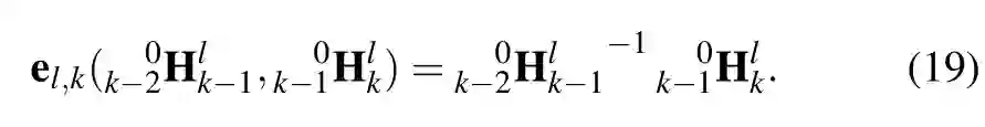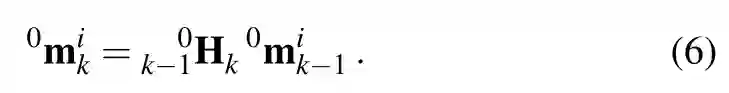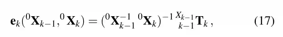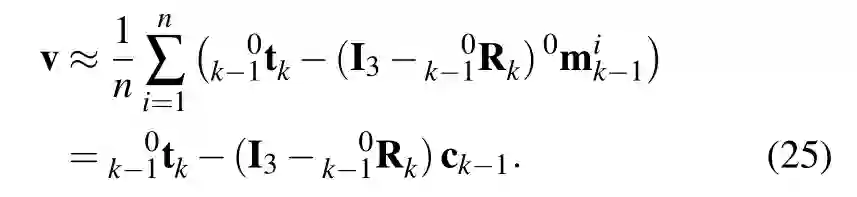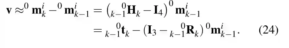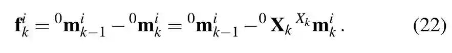 方程(6)是我们的运动估计方法的核心,因为它以无模型(model-free)的方式通过驻留在目标上的点表示刚体位姿变化,而不需要在估计中包含目标的三维位姿作为随机变量。第3.2.2节详细介绍了如何根据上述方程估计刚体的位姿变化。方程中的0k-1Hk 表示全局参照系中目标(提取出的)点的运动。对于本论文的其余部分,为了便于阅读,我们将这个量称为目标的位姿变化或目标的运动。