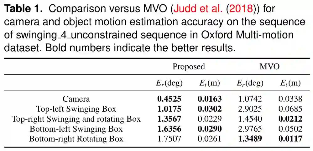 表1。VDO-SLAM与MVO (Judd et al. (2018))在牛津多运动数据集中的swinging-4_unconstrained序列上对于相机和目标运动估计精度的比较结果。粗体的数字表示更好的结果。