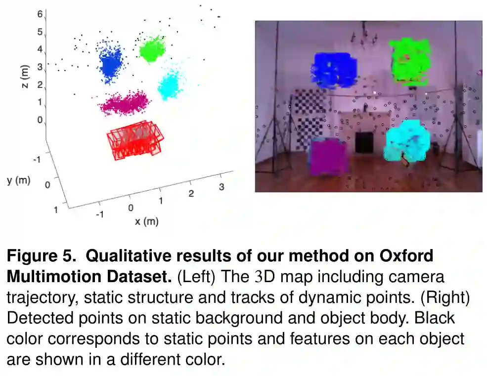 图5。我们的方法对牛津多运动数据集的定性结果。(左图:)含有相机轨迹、静态结构和动态点轨迹的3D地图。(右图:)静态背景和运动目标上检测得到的点。黑色点对应静态点,每个目标上的特征以不同的颜色显示。