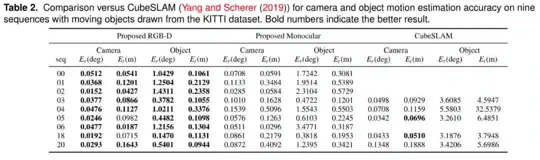 表2。VDO-SLAM与CubeSLAM (Yang and Scherer (2019))在KITTI数据集的第九个序列上对于相机和目标运动估计精度的比较结果。粗体的数字表示更好的结果。