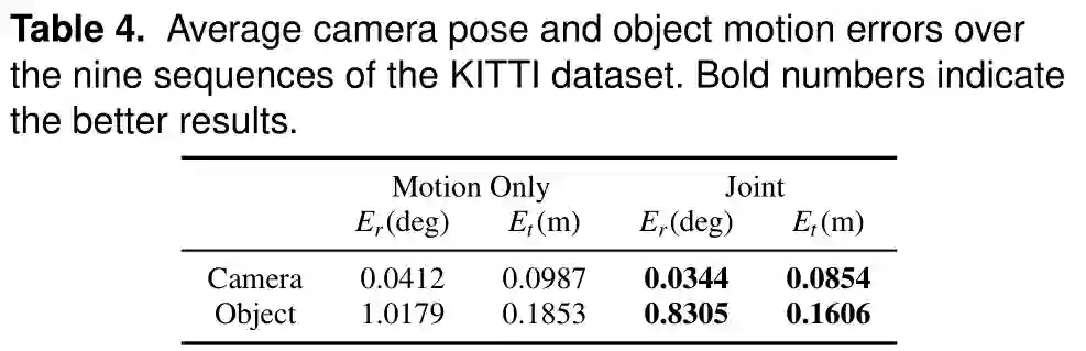 表4。KITTI数据集第九个序列上的(DVO-SLAM系统的)平均相机位姿和目标运动误差。粗体的数字表示更好的结果。