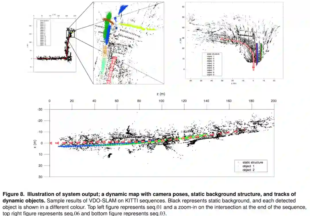 图8。系统输出的图例展示:含有相机位姿,静态背景结构,和动态目标位姿轨迹的动态地图。如图是VDO-SLAM对KITTI序列的样本结果。黑色点代表静态背景,每个检测到的(运动)目标都用不同的颜色显示。左上角的图片表示01序列,并对序列末尾结果进行了放大展示,右上角的图片表示06序列,底部的图片表示03序列。