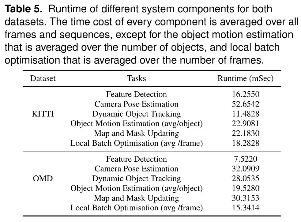 最后,我们提供DVO-SLAM系统的计算分析结果。实验在一台16GB内存的Intel Core i7 2.6 GHz笔记本电脑上进行。对目标语义分割和密集光流计算时间取决于电脑的GPU性能和CNN模型的复杂度。许多最新的算法都可以(在上面进行)实时运行(Bolya et al. (2019);Hui et al. (2020))。在本文中,语义分割和光流结果都是离线生成并输入到系统中。整个SLAM系统在CPU上用c++实现,使用修改后的g2o作为其后端 (K¨ummerleet al. (2011))。我们在表5中显示了DVO-SLAM在两个数据集上的计算时间。在局部批量优化中,窗口大小被设置为20帧,并有4帧的重叠。每个系统组件在所有帧和序列上的时间成本都是平均的。总的来说,我们提出的系统的跟踪部分可以根据检测到的运动物体的数量以5-8帧每秒的帧率运行,采用并行计算可以进一步改善性能。全局批量优化的运行时间很大程度上取决于场景中相机位姿数量(帧数)和目标密度(根据每帧观察到的动态目标的数量计算得到)。