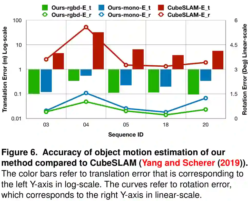 图6。VDO-SLAM与CubeSLAM (Yang and Scherer (2019))对于目标运动估计精度的比较结果。颜色竖条对应于左边y轴的数值,表示对数尺度下的平移误差。曲线表示旋转误差,在线性尺度上对应于右y轴。