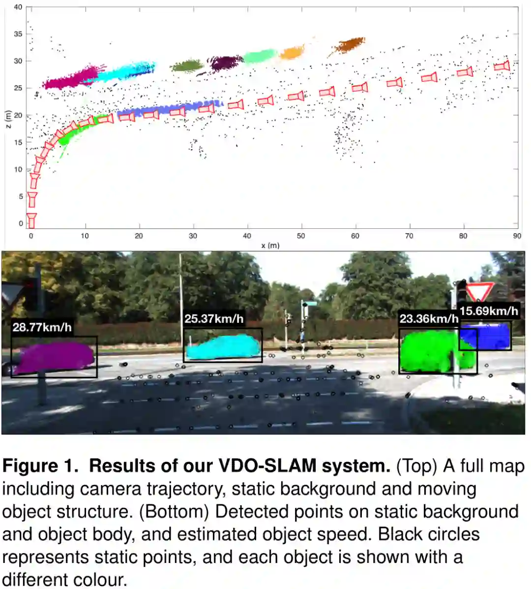 图1。VDO-SLAM系统的结果。(上图)一个完整的地图,包括相机轨迹,静态背景和移动目标的结构。(下图)静态背景上(运动)目标检测得到的点,以及被估计的目标(移动)速度。黑色的圆圈代表静态点,每个目标都用不同的颜色显示。