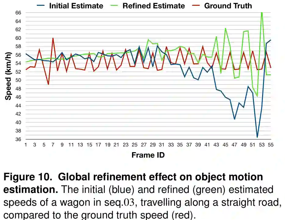 初始目标运动估计(在系统的跟踪部分)是独立于帧之间的,因为它纯粹与传感器的测量能力有关。如图10所示。蓝色曲线描述了在KITTI跟踪数据集的03序列中观察了55帧的货车的初始目标速度估计。如图所示,速度估计不平滑,在序列的后半部分出现了较大的误差。这主要是由于目标距离相机的距离增加导致,整个目标只占据了场景的一小部分。在这种情况下,使用传感器单独测量目标的运动估计变得具有挑战性且十分容易出错。因此,和在第3.3节讨论的内容相同,我们制定了一个因子图并对静态和动态结构都进行了细化。图10中的绿色曲线显示的是全局细化后的目标速度估计结果,序列的前半部分曲线变得更加平滑,后半段(误差)也得到了显著的改善。