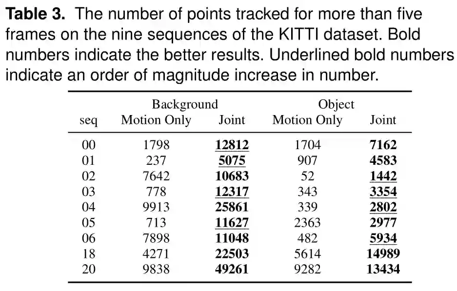 表3。在KITTI数据集的9个序列上跟踪超过5帧的点的数量。粗体的数字表示更好的结果。粗体下划线的数字表示增加的数量级。