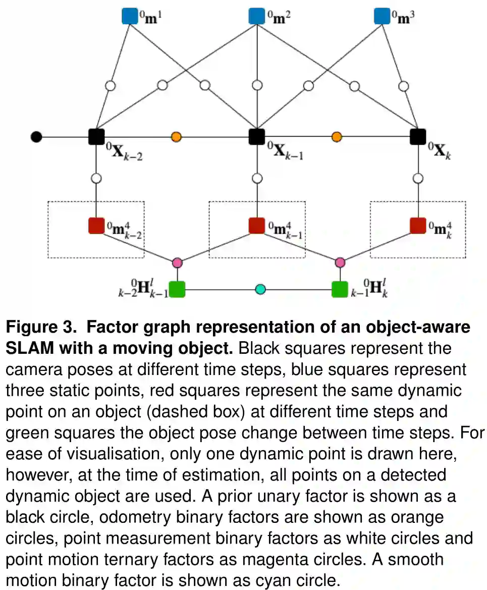 图3。带有移动位姿的目标感知SLAM的因子图。黑色方块表示相机在不同时间步长的位姿,蓝色方块表示三个静态点,红色方块表示一个运动目标(虚线框)在不同时间步长的相同动态点,绿色方块表示目标在不同时间步长的位姿变化。为了便于可视化,这里只画一个动态点,不过在估计时,被检测动态位姿上的所有点都会被使用到。先验一元因子以黑色圆圈表示,测程二值因子以橙色圆圈表示,点测量二值因子以白色圆圈表示,点运动三值因子以洋红色圆圈表示,平滑运动二元因子以青色圆圈表示。