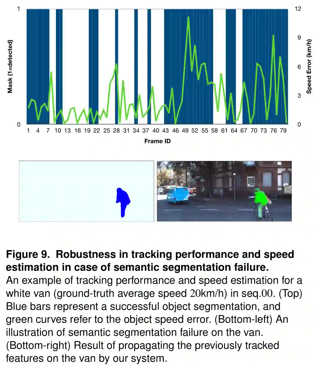 图9。当语义分割失败时,系统跟踪和速度估计的鲁棒性展示。如图是一个在00序列上对于白色货车(地面真实平均速度20km/h)在VDO-SLAM下跟踪和速度估计性能的展示例子。(上图)蓝色竖条代表成功的目标分割,绿色曲线代表目标的检测速度误差。(左下图)对货车语义分割失败的图例展示。(右下图)VDO-SLAM在货车(语义分割)之前的跟踪特征结果