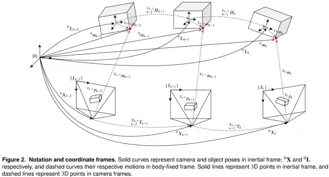 0Xk,0Lk 分别为在全局参考系0中k时刻的机器人/相机和目标的三维位姿,其中k 为时间步长的集合。特别地,在我们的表示法中,大写字母用来表示指标集。图2中将这些位姿转换显示为实线。
