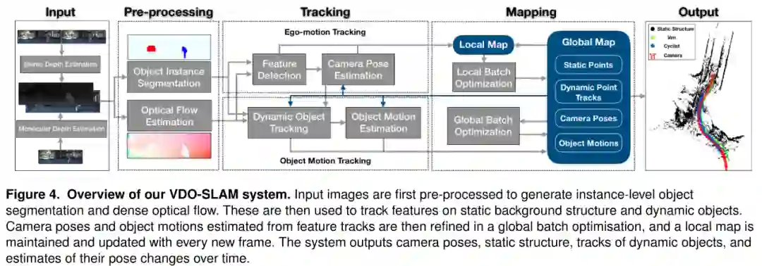 图4。VDO -SLAM系统概述。首先对输入图像进行预处理,生成实例级位姿分割和密集光流。然后,对预处理后的图像跟踪静态背景结构和动态位姿的特征。接着在全局批量优化中细化根据特征轨迹估计得到的相机位姿和目标运动,并根据每一帧更新局部地图。该系统能够输出相机位姿,静态结构,动态目标位姿的轨迹,并可以估计其随时间的位姿变化情况。
