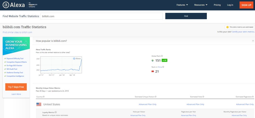 Alexa排名是全球最权威的网站排名之一,常用于查询某个网站的综合排名,独立访客,PV、访客来源等,这些信息都有助于网站进行关键词优化、做竞品对比、改善流量等。如果只是查查近期排名和访客情况,免费版已经够用。