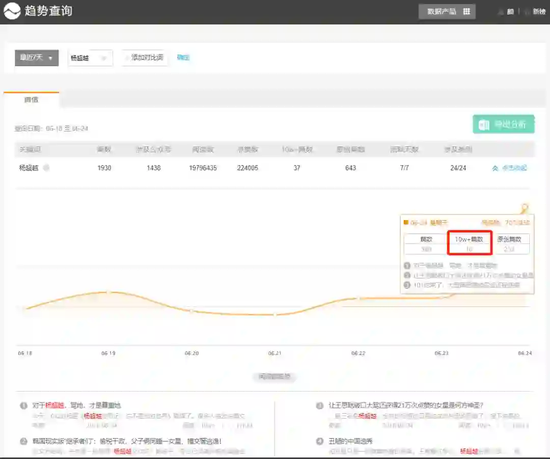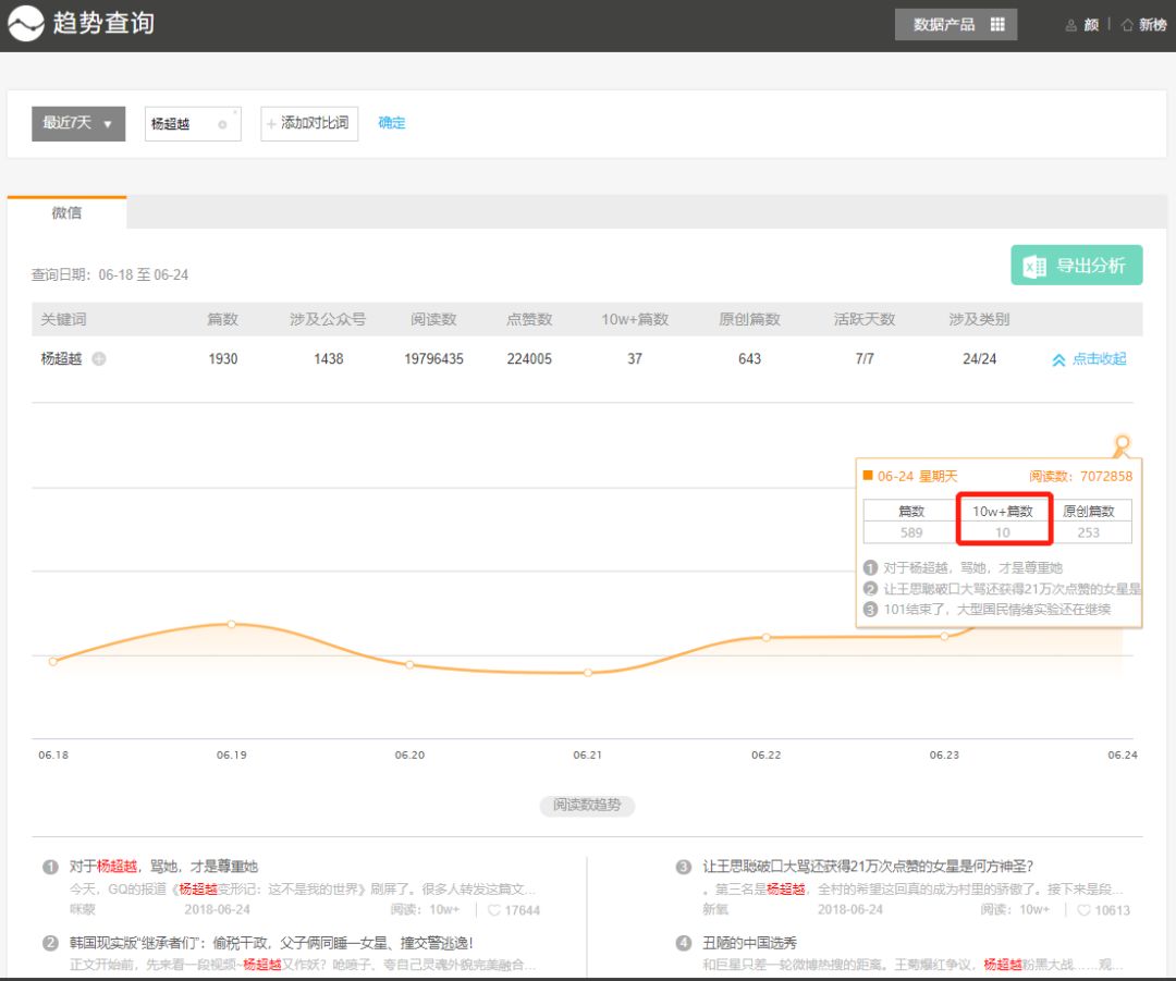 通过新榜趋势查询,用户能清晰看到某关键词在微信公众号中传播总量变化趋势。同时支持5组关键词查询对比,支持对指定关键词的与或非条件及微信字段进行自定义,使查询更精确。而且,所有数据付费用户都可以一键下载。
