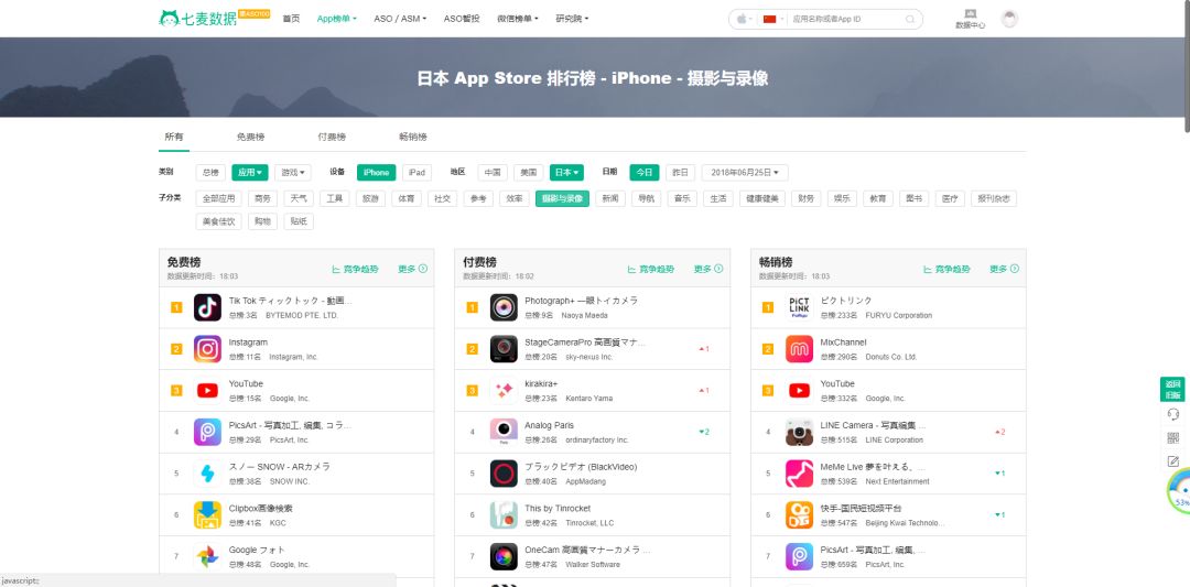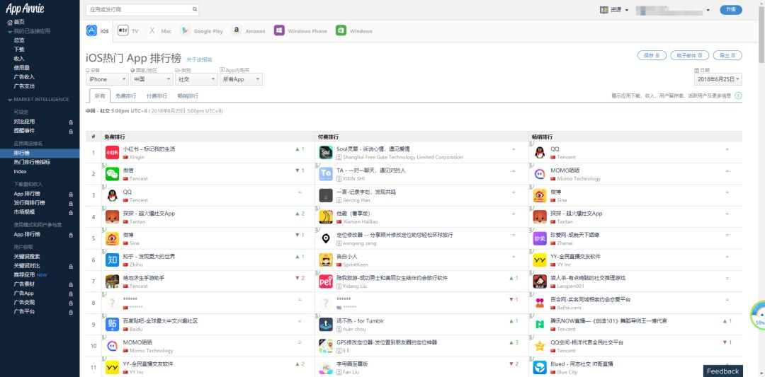可按设备、国家、类别、是否付费查看应用的排名,也可查看单个应用的历史版本(这个很有用),历史排名和在不同国家的使用排名。但基础用户只能查看三个月内数据,如需升级,需要和销售经理联系。