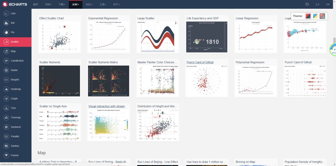 这是百度团队开发的一款开源数据可视化工具,重点是,网页中已经内置了不少模板,常见的折线图、饼状图和散点图之外,还有热力分布图、树状图、辐射图、3D图和形象化图表等,直接更改数据就可用,不论是做图,还是进行数据分析,都非常方便。