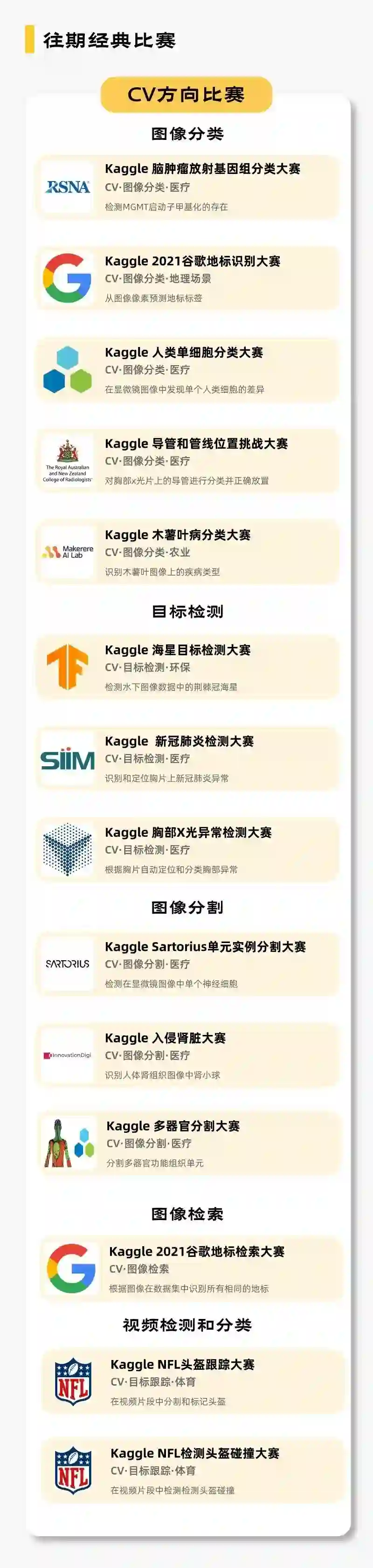 CV方向选出了14场比赛,涵盖图像分类、图像分割、目标检测、视频分类等CV经典任务,覆盖农业、医疗、体育等应用领域。