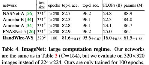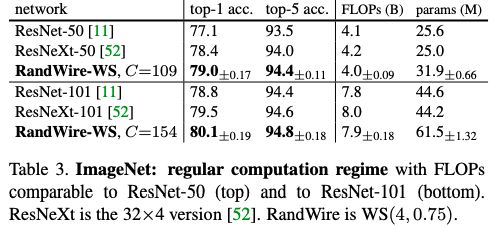 表 3 比较了 RandWire 与 ResNet 和 ResNeXt 在与 ResNet-50/101 类似的 FLOPs 的情况下的性能。RandWire 的平均准确率分别比 ResNet50 和 ResNet-101 高 1.9% 和1.3%,比 ResNeXt 高 0.6%。