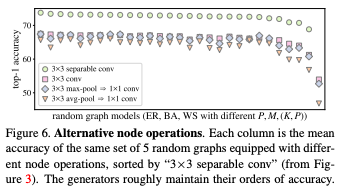 我们还观察到,对于同一生成器生成的不同随机网络,精度的方差较低,但不同生成器之间存在明显的精度差距。这些观察结果表明,网络生成器的设计很重要。