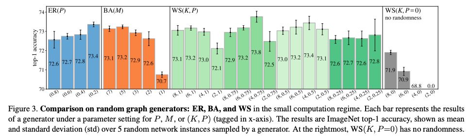 图 3 比较了小型计算环境中不同生成器的结果:每个 RandWire 网络有~580M FLOPs。