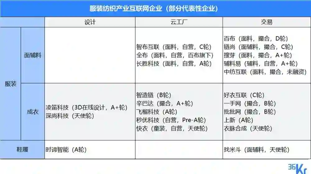 但这批勇者,已经各自从不同的起点出征。根据调研结果,我们将产业互联网企业最初的业务切入点归纳为三类:设计(研)、云工厂(产)、交易(销),又根据主营品类分为纺织面料、成衣制造、鞋履,并挑选出了部分代表性企业,制成下表: