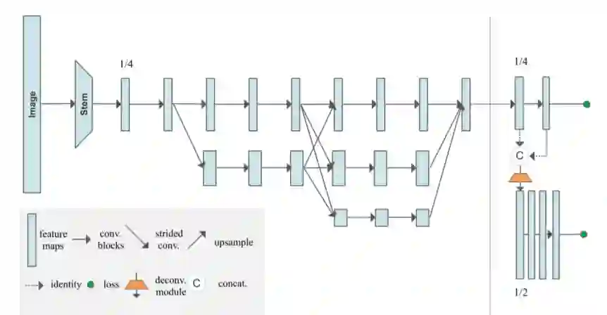 为了解决多尺度问题,我们进一步设计了一个高分辨率特征金字塔。传统的特征金字塔一般从一个很小的分辨率(比如1/32)开始,通过一系列上采样操作得到1/4 分辨率的特征。我们提出的高分辨率特征金字塔则是从1/4 分辨率出发,通过 transposed convolution 得到更高分辨率的特征。在训练的过程中,我们使用多分辨率监督让不同层的特征能学习不同尺度的信息。我们也利用多分辨率融合,把不同分辨率的热度图统一放大到原图大小并且融合到一起,从而得到一个对尺度敏感的特征。