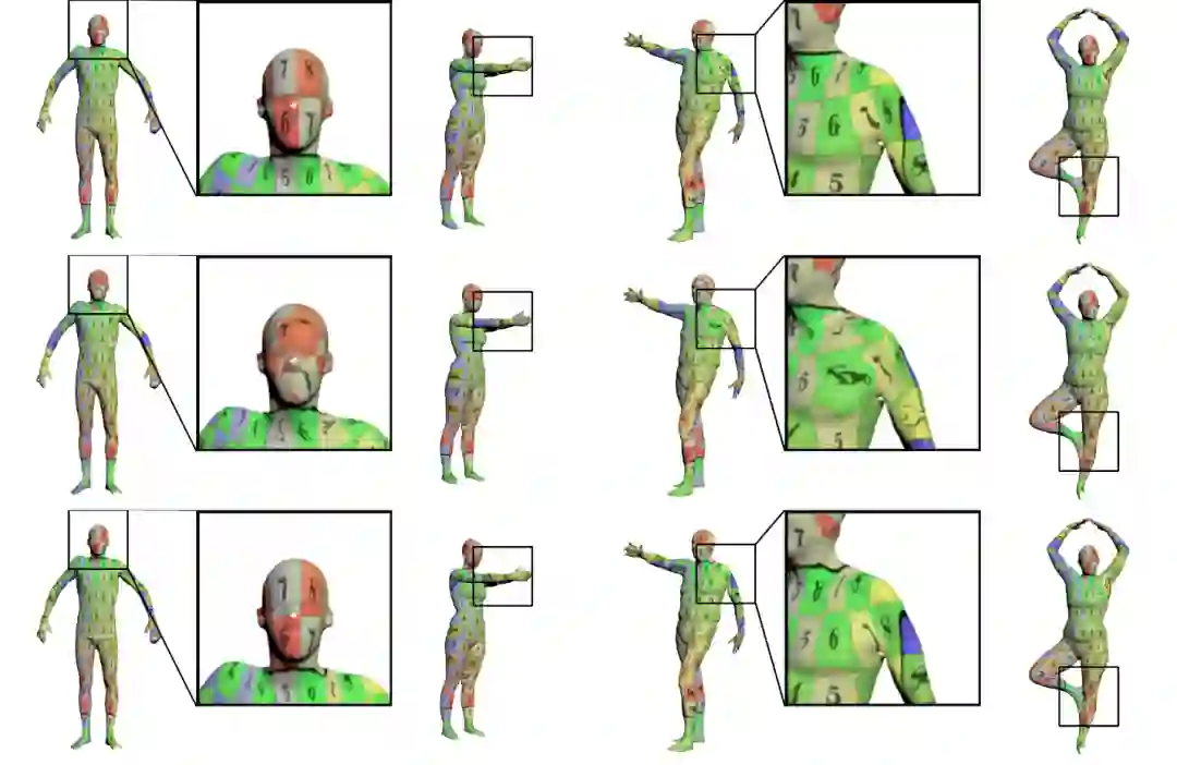 图5:人体表面注册结果。上中下行依次为:标注的 ground truth 注册对应的纹理映射、SOTA 方法的结果、我们的结果。可以看到,我们的结果注册扭曲更小,对于表面拓扑的变化更鲁棒。