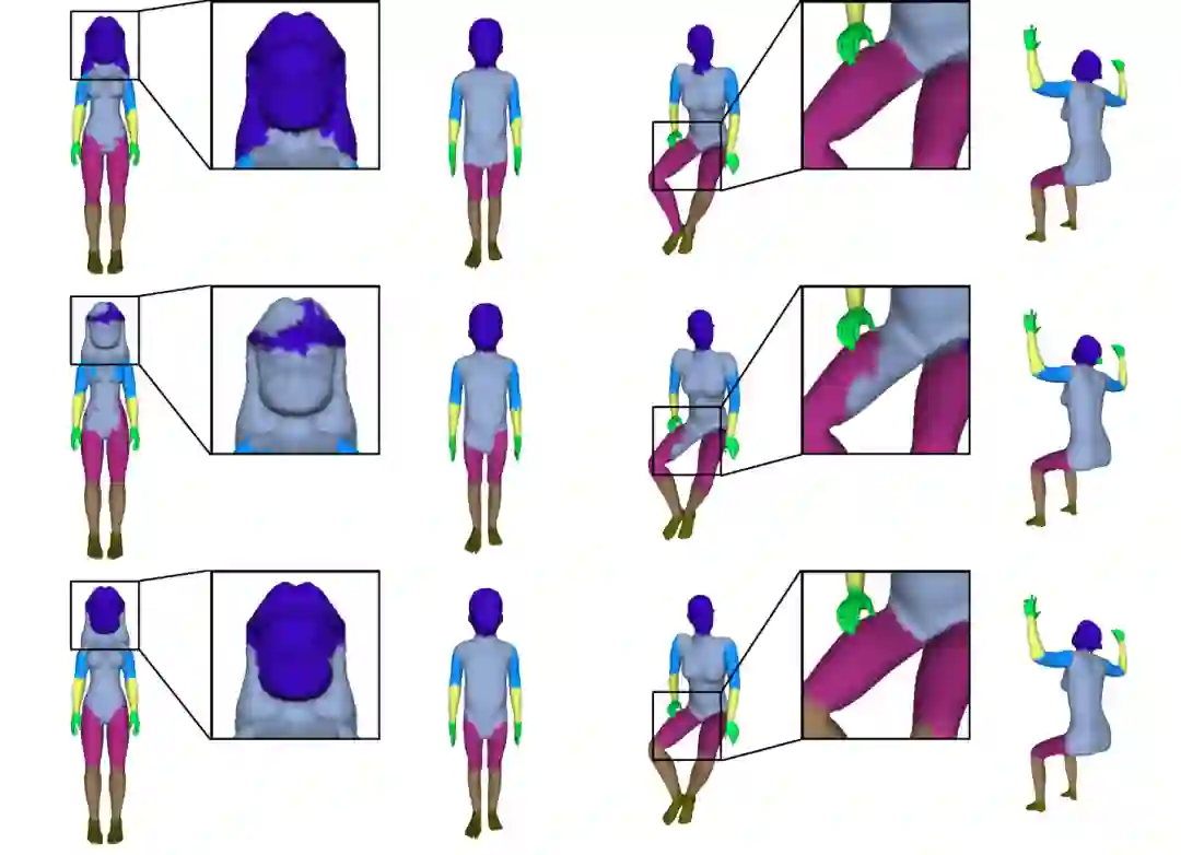 图4:人体表面分割结果。上中下行依次为:人工标注的 ground truth 分割、SOTA 方法的结果、我们的结果。可以看到,我们的结果更准确合理。