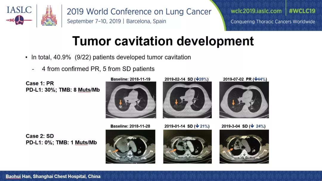 另外值得注意的是,总共40.9%(9/22)的患者治疗后出现肿瘤内空洞形成,其中4例患者为确认的PR,5例患者疗效为SD(图5)。