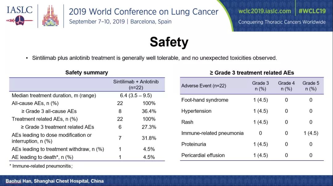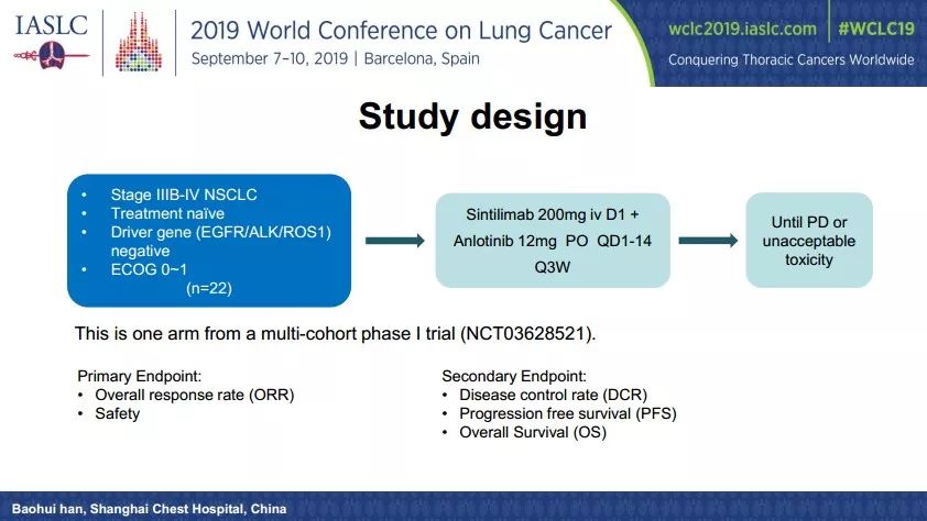当地时间9月7日上午,上海市胸科医院韩宝惠教授在“Joint IASLC-CSCO-CAALC Session”口头汇报了信迪利单抗联合安罗替尼一线治疗驱动基因(EGFR/ALK/ROS1)阴性晚期非小细胞肺癌(NSCLC) 的Ⅰ期临床研究结果,联合方案初步观察安全、可耐受,主要研究终点客观缓解率(ORR)高达72.7%,同时疾病控制率(DCR)达100%[1],有望成为晚期NSCLC一线治疗新的选择!