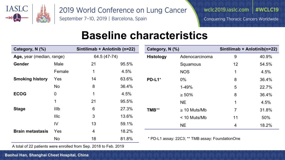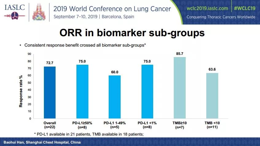 2018年9月至2019年2月,研究入组22例患者,男性占95.5%,63.6%的患者有吸烟史,鳞癌占54.5%,4例患者合并脑转移。同时21例中进行了PD-L1表达检测;18例患者进行了肿瘤突变负荷(TMB)检测(表1)。
