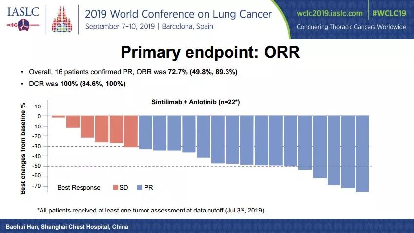 数据截止2019年7月3日,16例患者确认为部分缓解(PR),6例患者疾病稳定(SD),ORR高达72.7%(49.8%~89.3%),DCR为100% (84.6%~100%)(图2)。