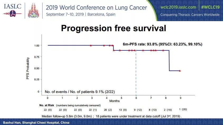 数据截止时,81.8%(18/22)的患者仍在接受治疗中,仅2例患者发生PFS事件,PFS数据尚不成熟,预估6个月 PFS率为93.8%(95%CI:63.23%~99.10%)(图4)。