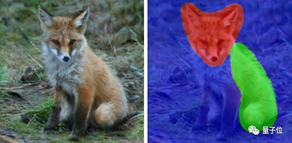 通俗地说,图上的各种色彩代表不同的标签,共同组成一张标签图 (Label Map) 。比如,红色是狐狸的头: