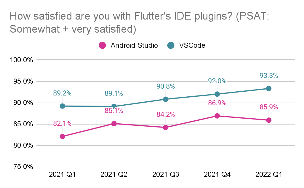 我们还询问了对 Flutter 的 IDE 支持的满意度,VS Code 用户对此更为满意。(我们记录了开发者从 IDE 打开调研问卷时是在使用哪个 IDE。当开发者单击问卷链接时,我们会告知他们将对此信息进行记录。)