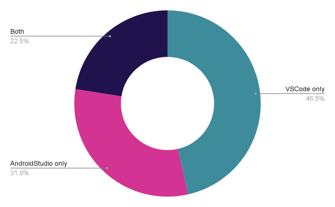 仍然有大约 23% 的 Flutter 开发者同时使用 VS Code 和 Android Studio。当询问他们为什么使用多个 IDE 时,最常见的回答是,VS Code 用户需要使用 Android Studio 和 Xcode 来实现特定于原生设备的功能,例如模拟器设置、构建配置、发布需求 (例如密钥生成和签名),以及开发 Flutter + 原生混合式应用。