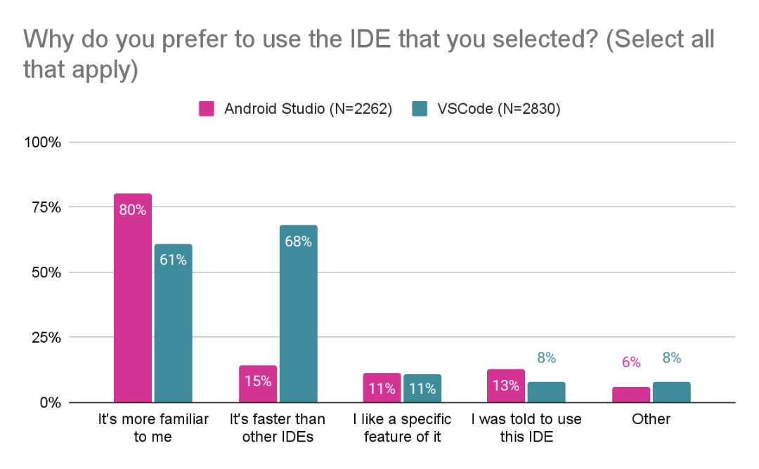 △ 图 2. 根据 2019 年第三季度的调研,80% 的 Android Studio 用户和 61% 的 VS Code 用户表示,他们选择 IDE 是因为对其更熟悉。