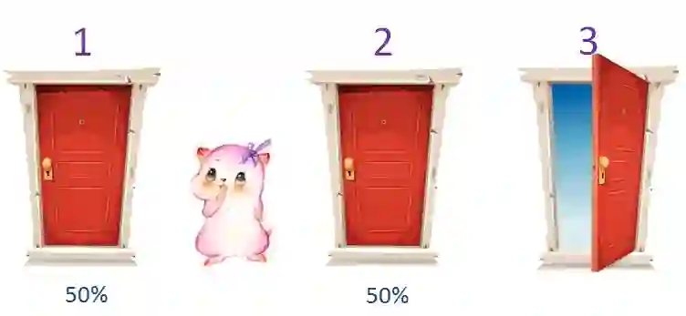 “当最后剩下两扇门的时候,此时讨论的获奖率应该是一个独立事件,和之前参与者怎么选择,以及主持人打开空门这些事,应该完全无关才对呀?既然是一个独立事件,那么二选一,难道获奖率不是50%吗?”