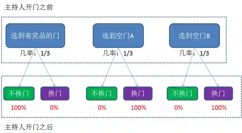 此时,换门也包括两种换法,但无论怎样选择,获奖率都各占1/3: