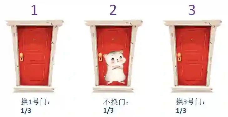 此时主持人给了参与者重新选择的机会:可以坚持刚才选择的门(在图中是2号门),也可以换另一扇没有打开的门(在图中是1号门)。