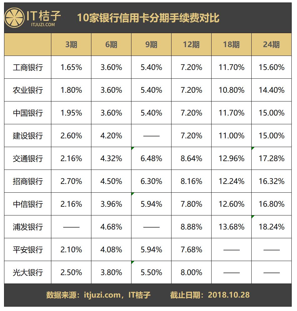 各银行最新的分期手续费对比见下表(截至 2018 年 10 月):